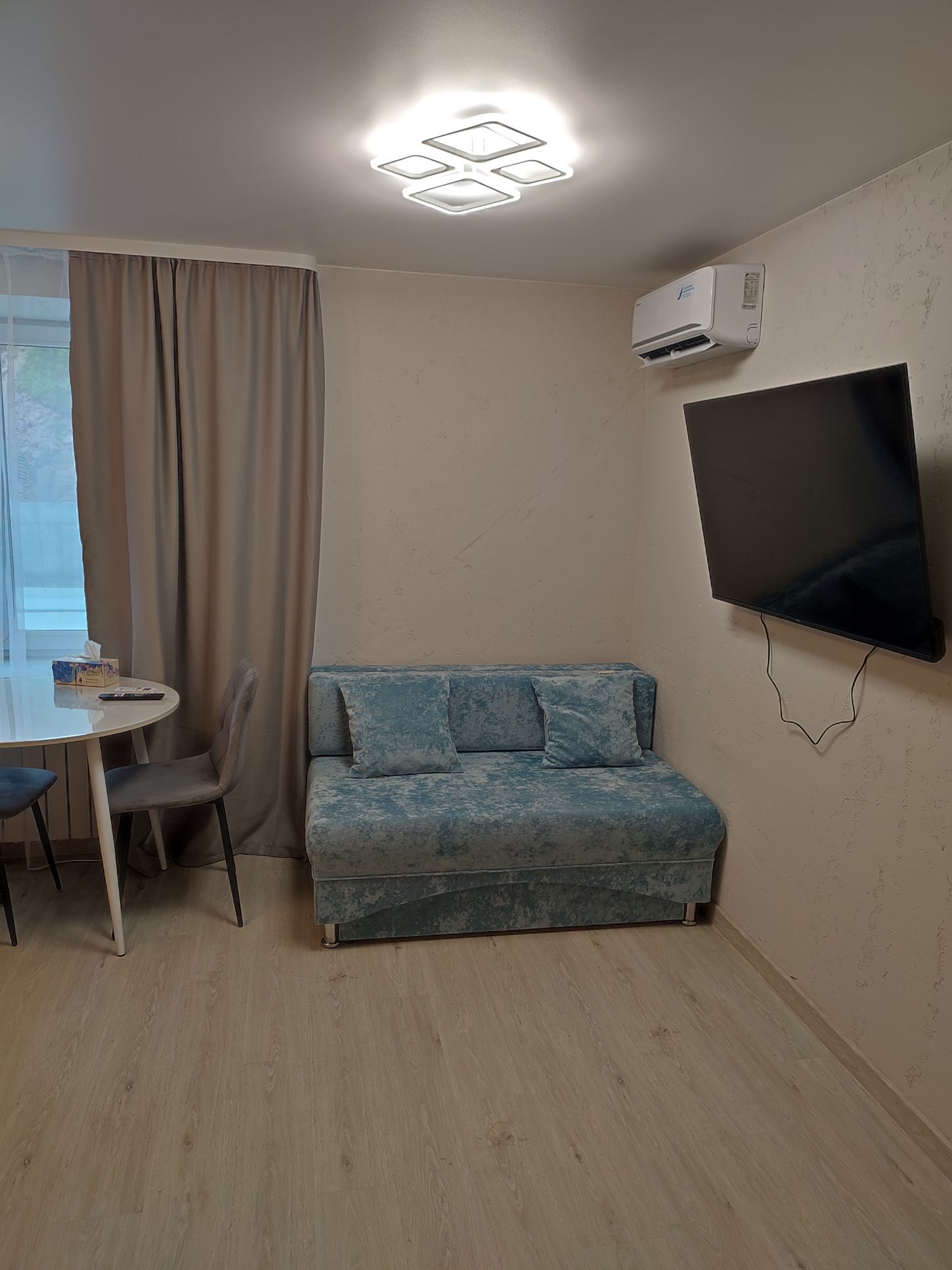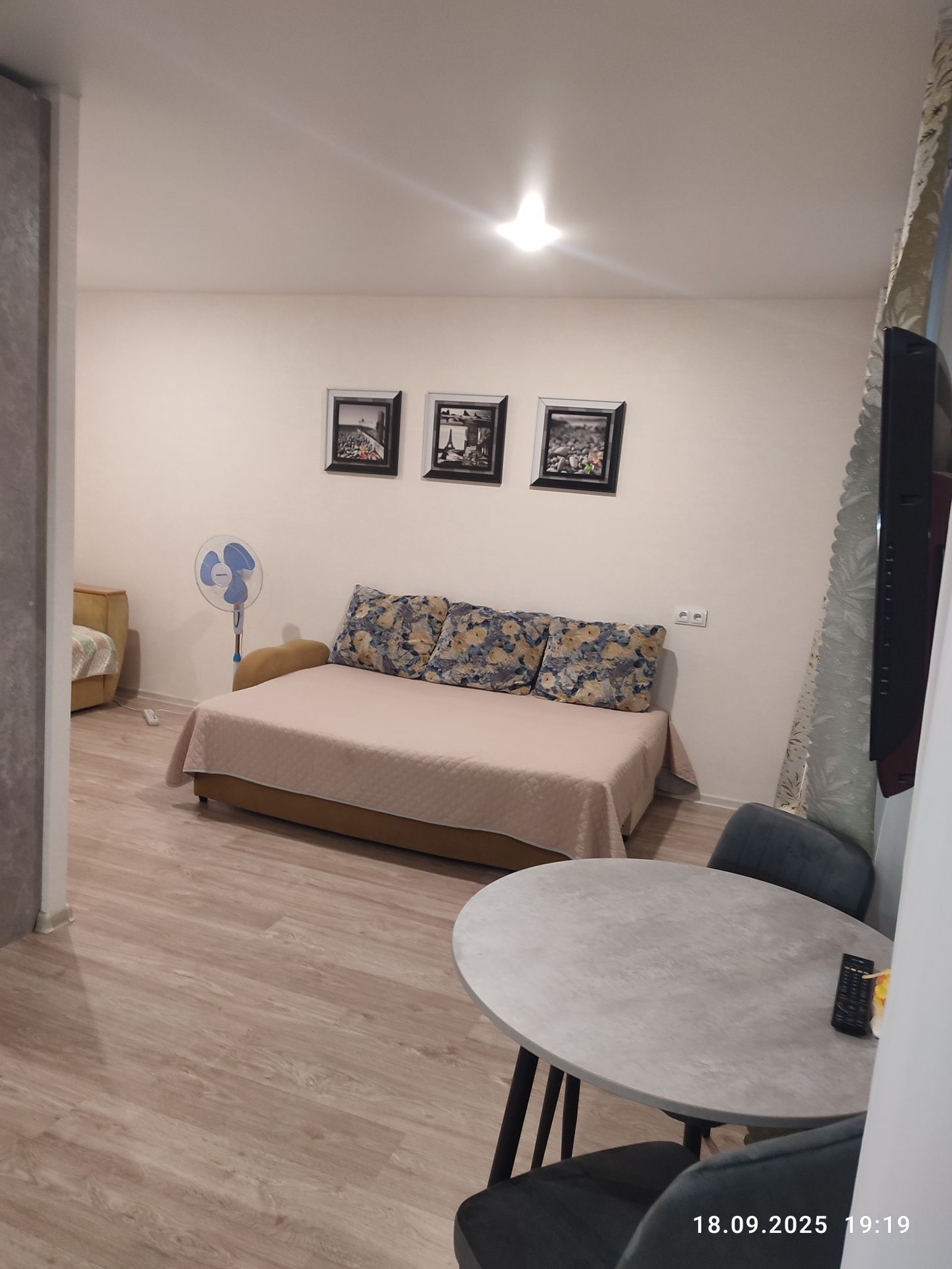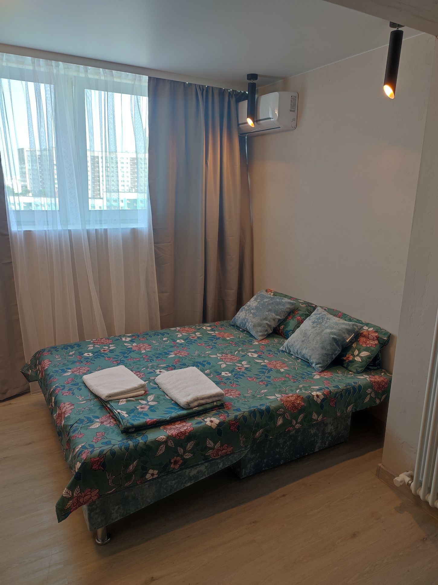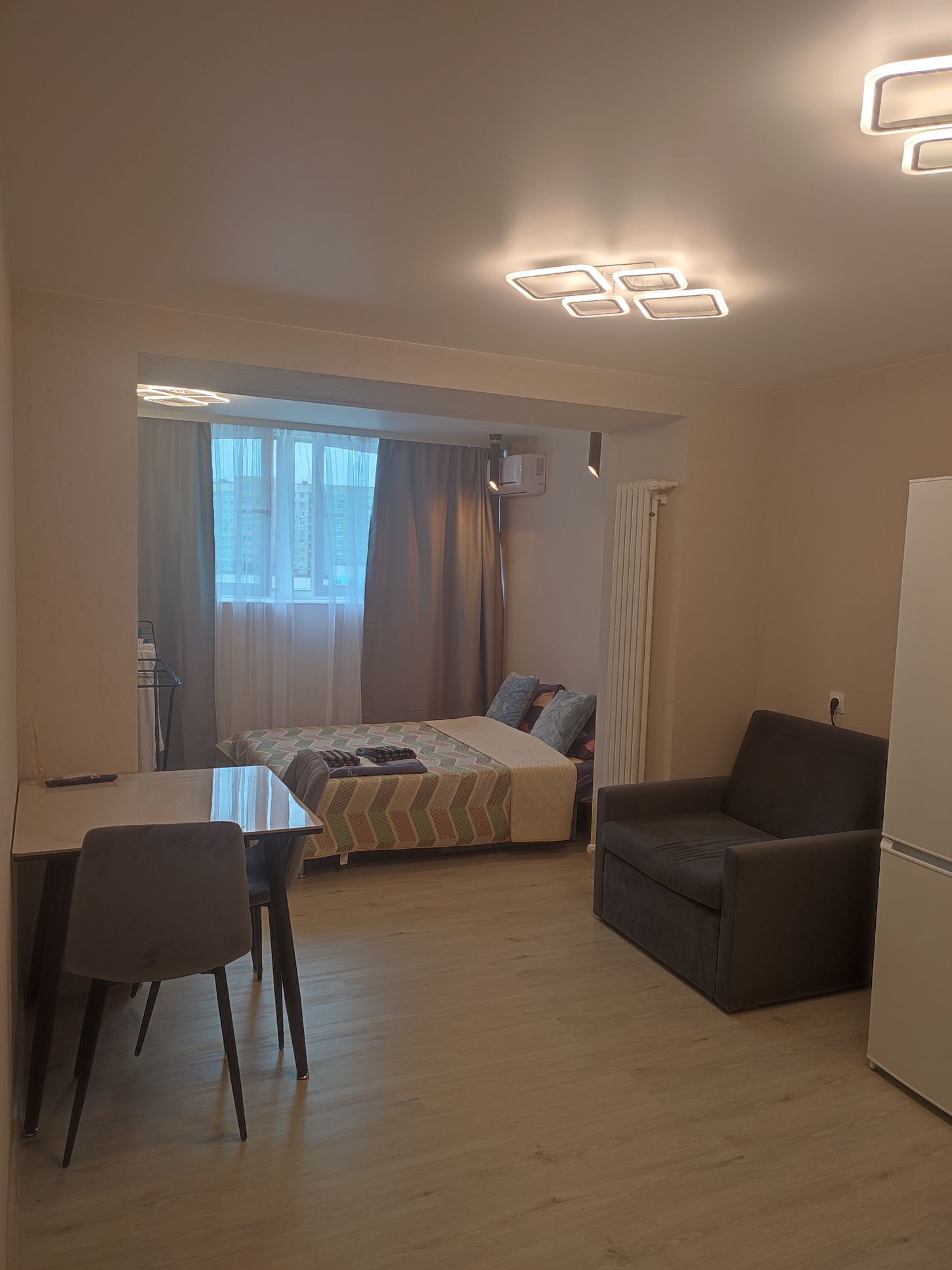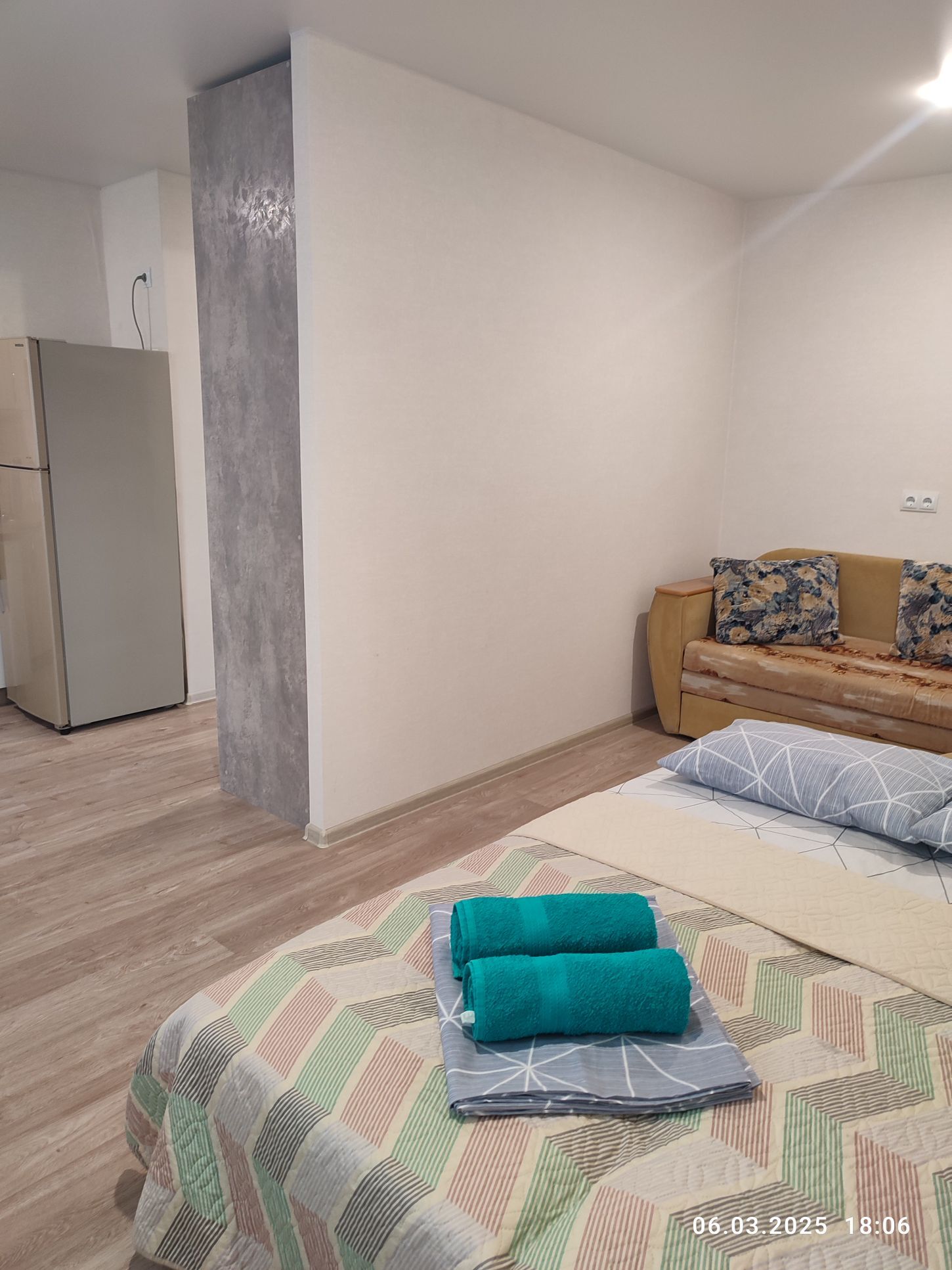 Комфортная, новая, евро студия! Небольшая, аккуратная с видом на город, двухспальный раскладной диван, а также раскладное кресло, полноценное спальное место, смарт телевизор ВНИМАНИЕ! залог не возвращается если оставлен мусор, не помыта посуда, а так же грязь, хаос после себя. Возврат залога после 18:00 при соблюдении правила. 28 м2. 3 гостя, 2 кровати, Кухня-гостиная, Этаж 5 из 12, Лифт, 1 ванная, комната, Бесплатная парковка. Кондиционер, Беспроводной интернет Wi-Fi, Телевизор, Электрический чайник, Фен, Микроволновка, Рабочий стол, Стиральная машина, Блэкаут шторы, Шкаф, Холодильник. Кухня-гостиная: Электроплита, Микроволновка, Фильтр для воды, Посуда и принадлежности, Столовые приборы, Электрический чайник, Холодильник, Морозильник, Кухонный гарнитур, Обеденный стол Ванная комната 1 туалет, 1 ванная комната с туалетом, Полотенца, Туалетные принадлежности, Фен, Душ, Тапочки, Гигиенический душ