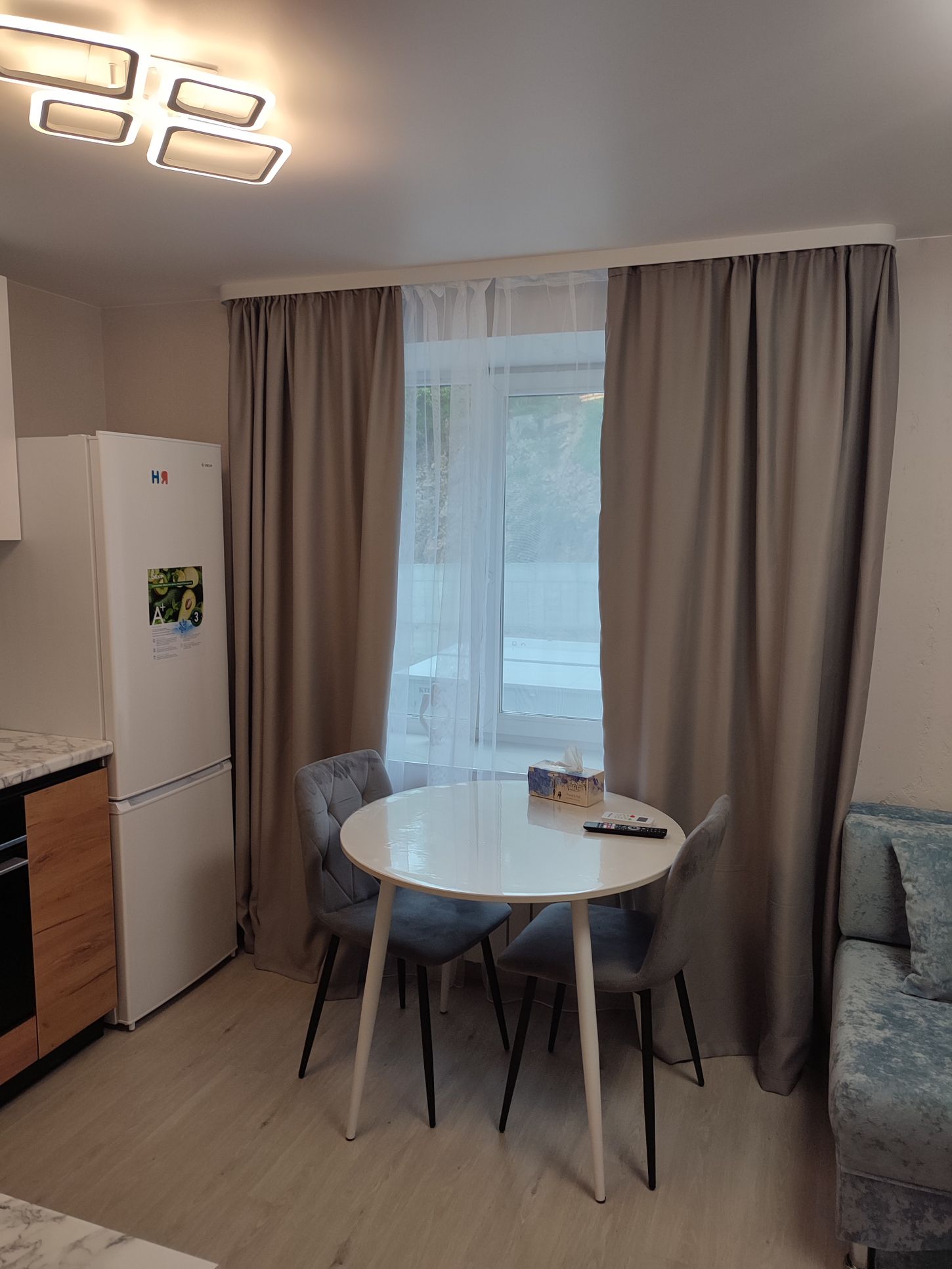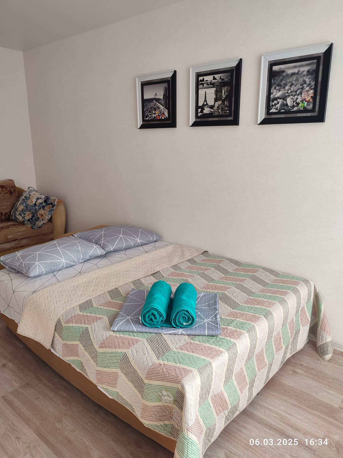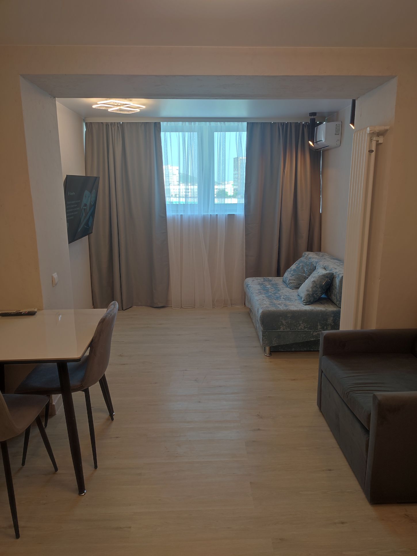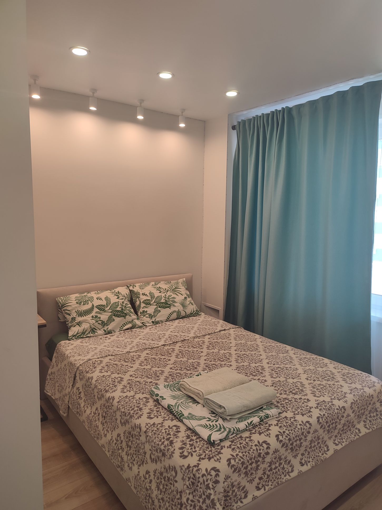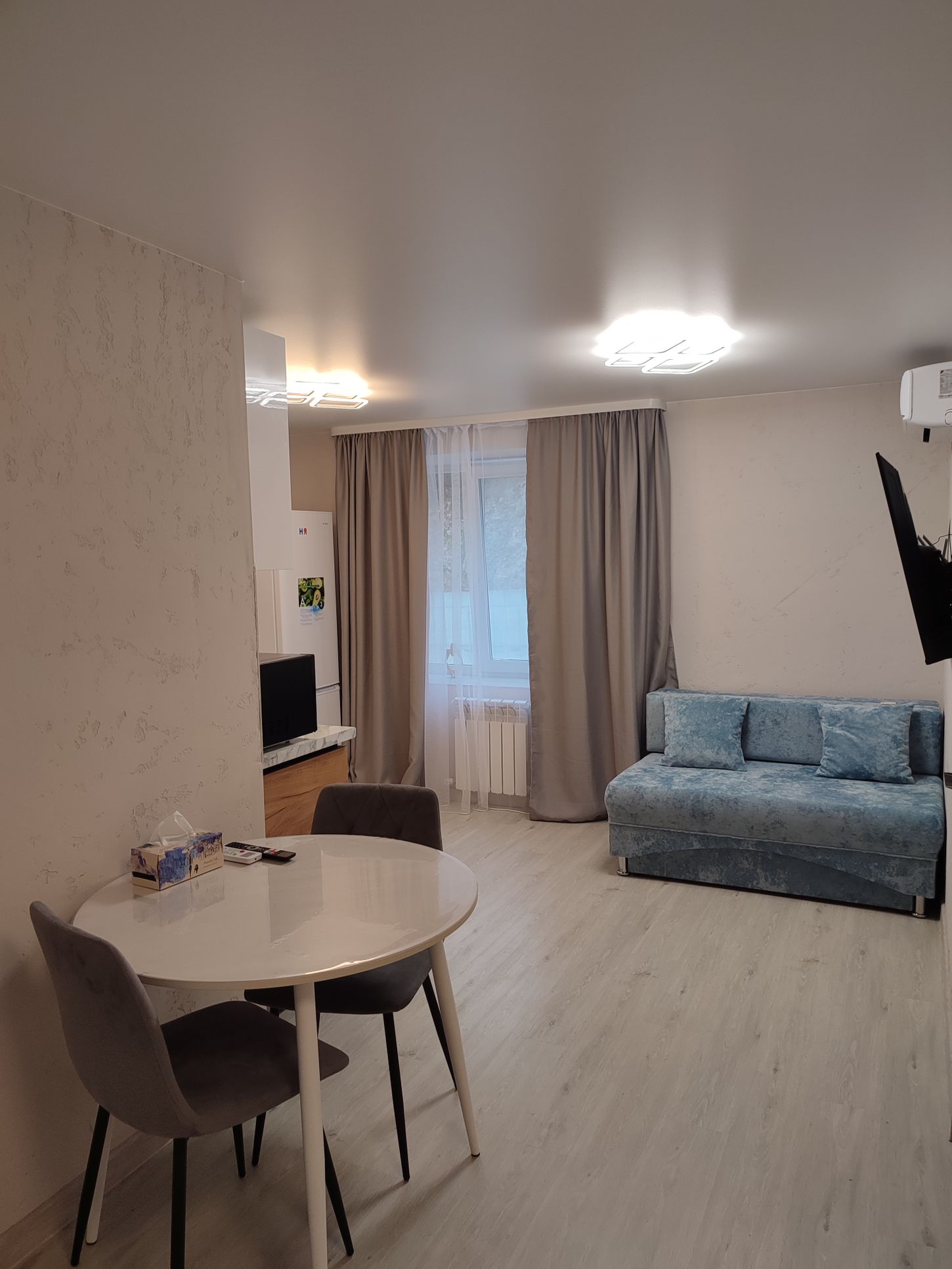 Комфортная, новая, евро студия! Небольшая, аккуратная с видом на город, двухспальный раскладной диван, а также раскладное кресло, полноценное спальное место, смарт телевизор ВНИМАНИЕ! залог не возвращается если оставлен мусор, не помыта посуда, а так же грязь, хаос после себя. Возврат залога после 18:00 при соблюдении правила. 28 м2. 3 гостя, 2 кровати, Кухня-гостиная, Этаж 5 из 12, Лифт, 1 ванная, комната, Бесплатная парковка. Кондиционер, Беспроводной интернет Wi-Fi, Телевизор, Электрический чайник, Фен, Микроволновка, Рабочий стол, Стиральная машина, Блэкаут шторы, Шкаф, Холодильник. Кухня-гостиная: Электроплита, Микроволновка, Фильтр для воды, Посуда и принадлежности, Столовые приборы, Электрический чайник, Холодильник, Морозильник, Кухонный гарнитур, Обеденный стол Ванная комната 1 туалет, 1 ванная комната с туалетом, Полотенца, Туалетные принадлежности, Фен, Душ, Тапочки, Гигиенический душ
