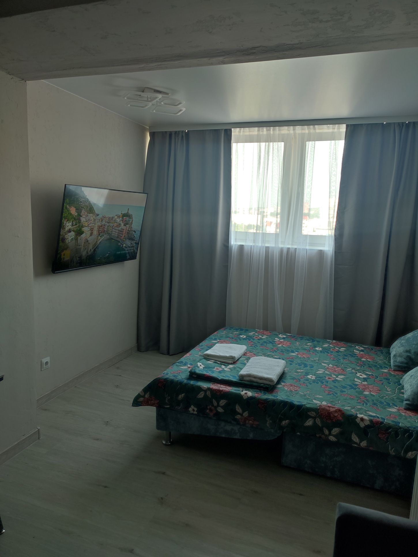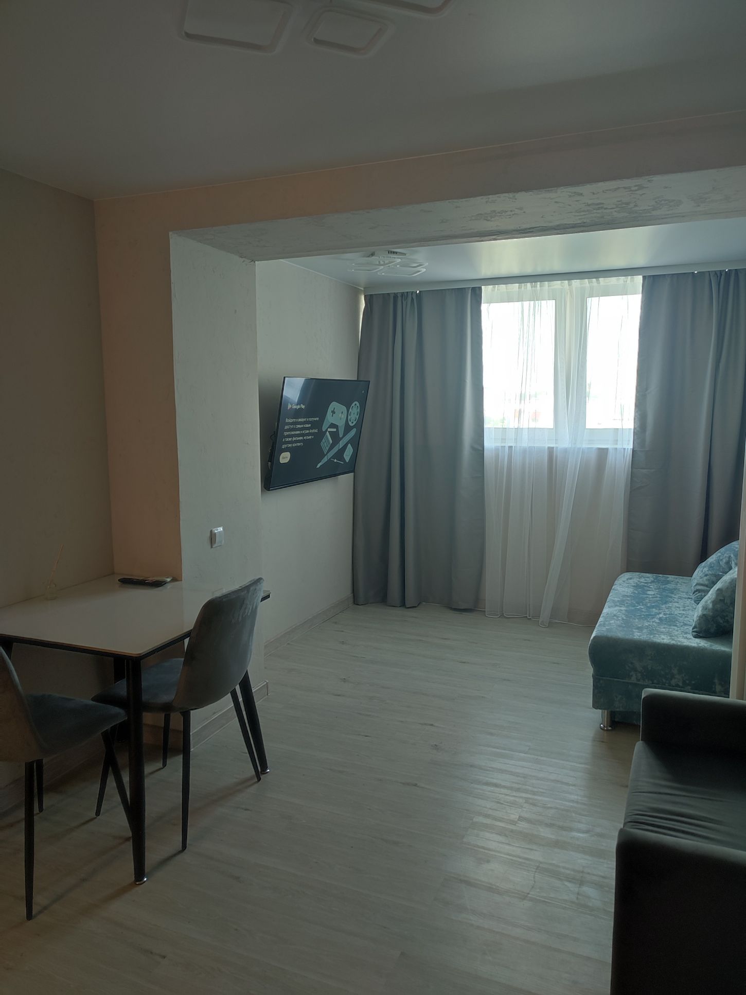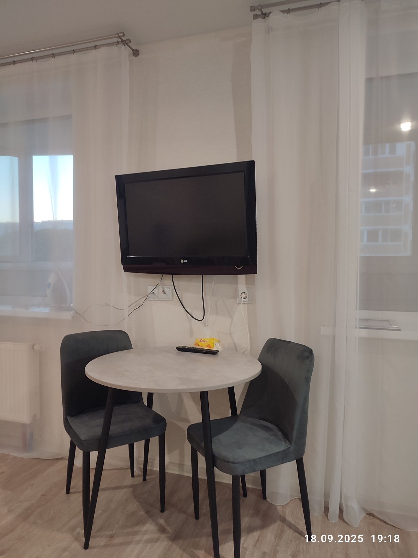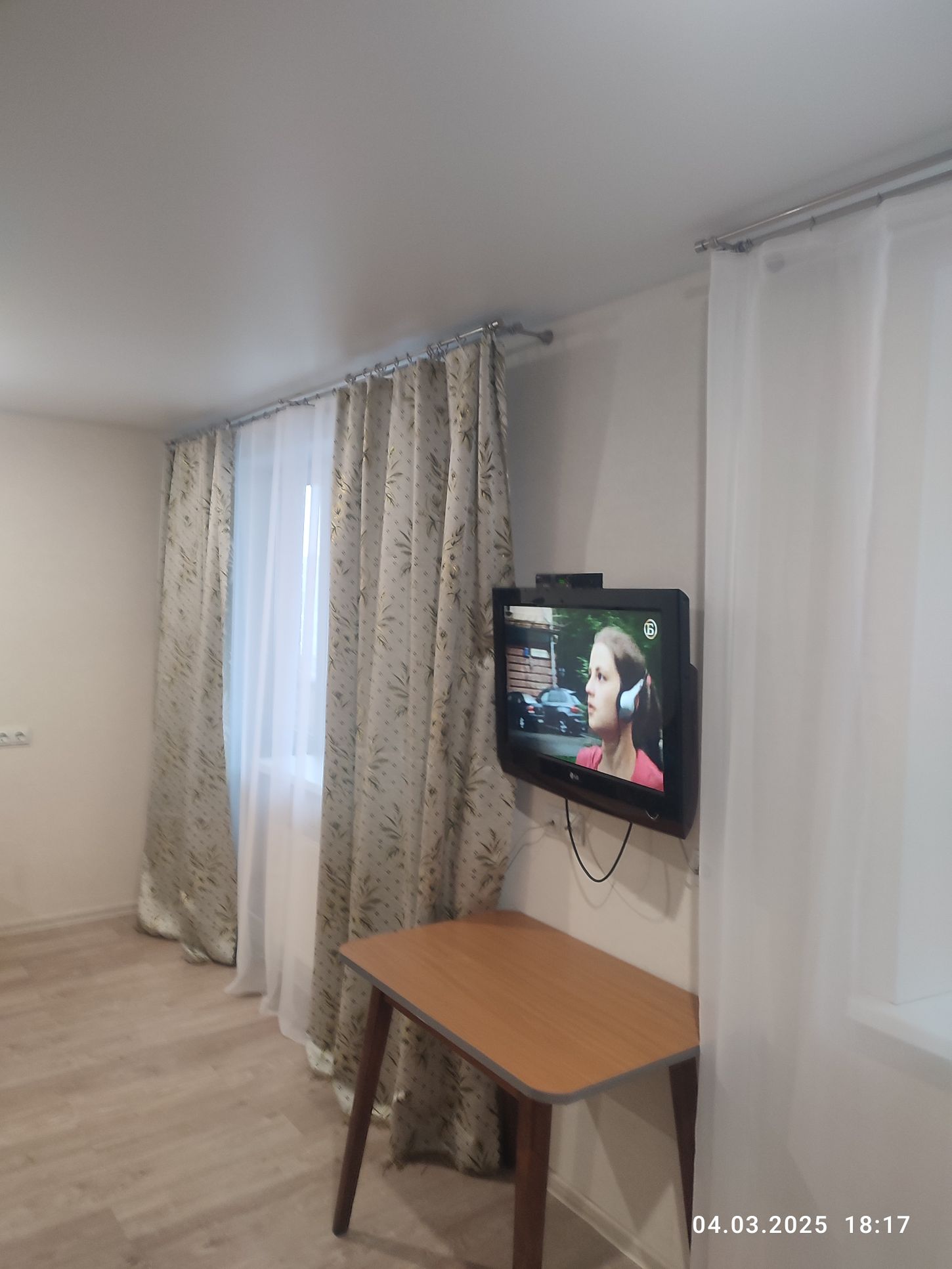 Комфортная, новая, евро студия! Небольшая, аккуратная с видом на город, двухспальный раскладной диван, а также раскладное кресло, полноценное спальное место, смарт телевизор ВНИМАНИЕ! залог не возвращается если оставлен мусор, не помыта посуда, а так же грязь, хаос после себя. Возврат залога после 18:00 при соблюдении правила. 28 м2. 3 гостя, 2 кровати, Кухня-гостиная, Этаж 5 из 12, Лифт, 1 ванная, комната, Бесплатная парковка. Кондиционер, Беспроводной интернет Wi-Fi, Телевизор, Электрический чайник, Фен, Микроволновка, Рабочий стол, Стиральная машина, Блэкаут шторы, Шкаф, Холодильник. Кухня-гостиная: Электроплита, Микроволновка, Фильтр для воды, Посуда и принадлежности, Столовые приборы, Электрический чайник, Холодильник, Морозильник, Кухонный гарнитур, Обеденный стол Ванная комната 1 туалет, 1 ванная комната с туалетом, Полотенца, Туалетные принадлежности, Фен, Душ, Тапочки, Гигиенический душ