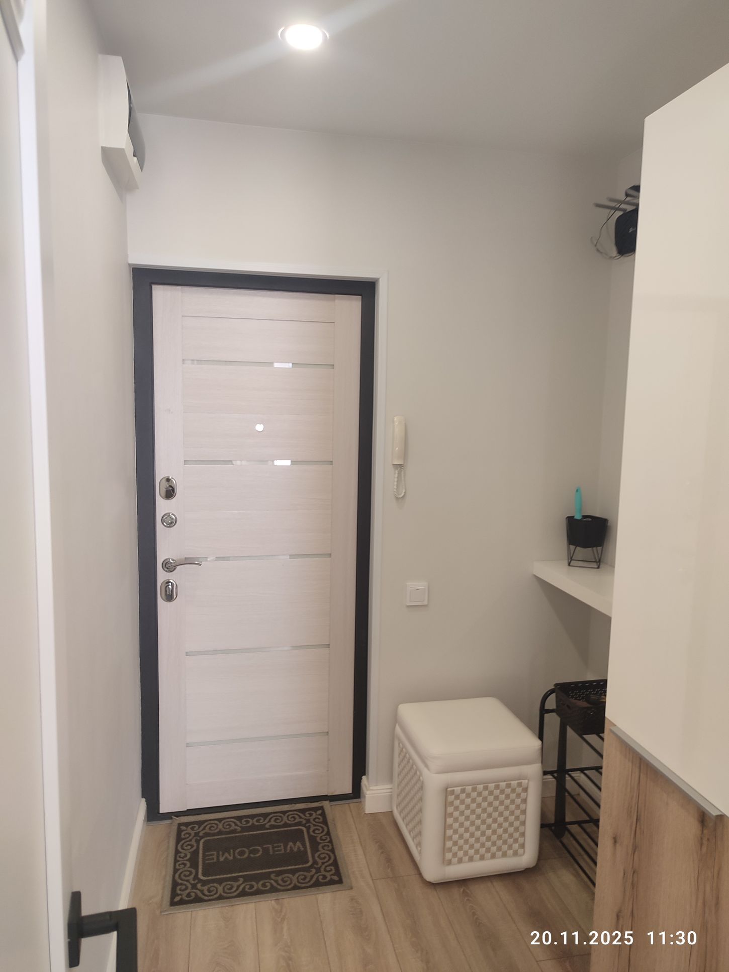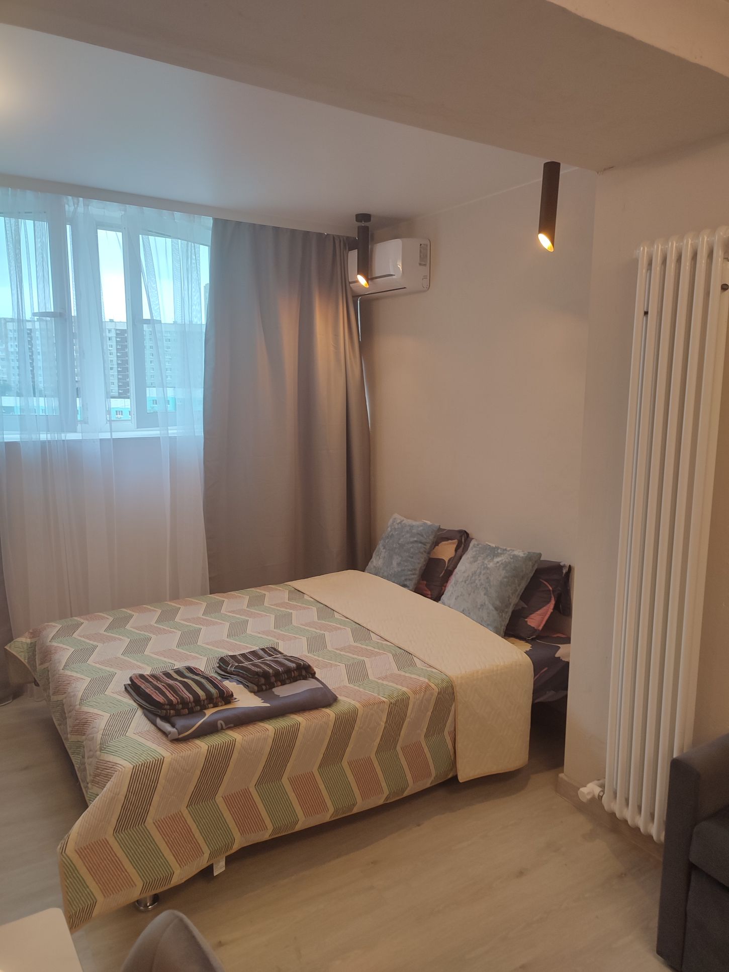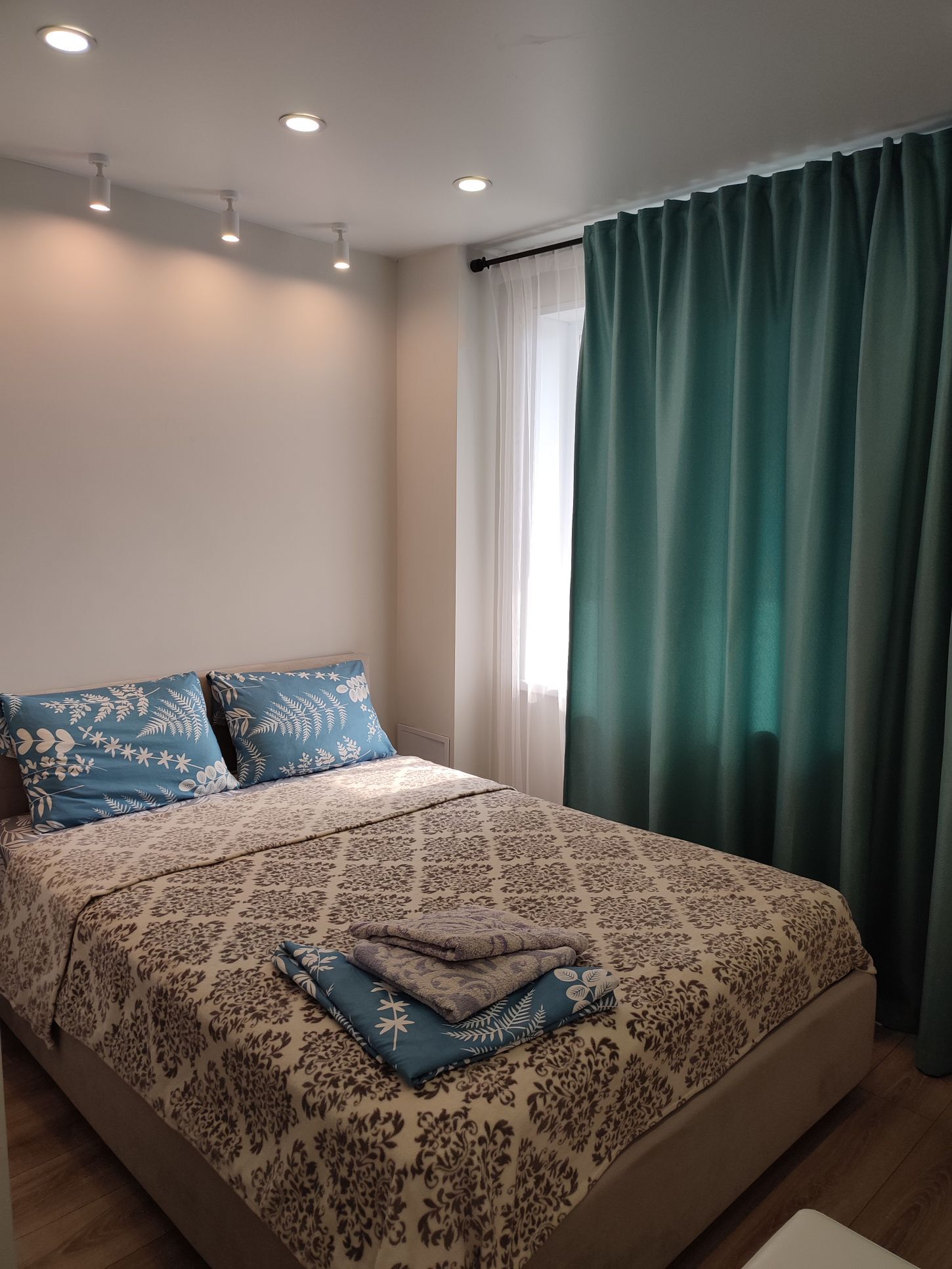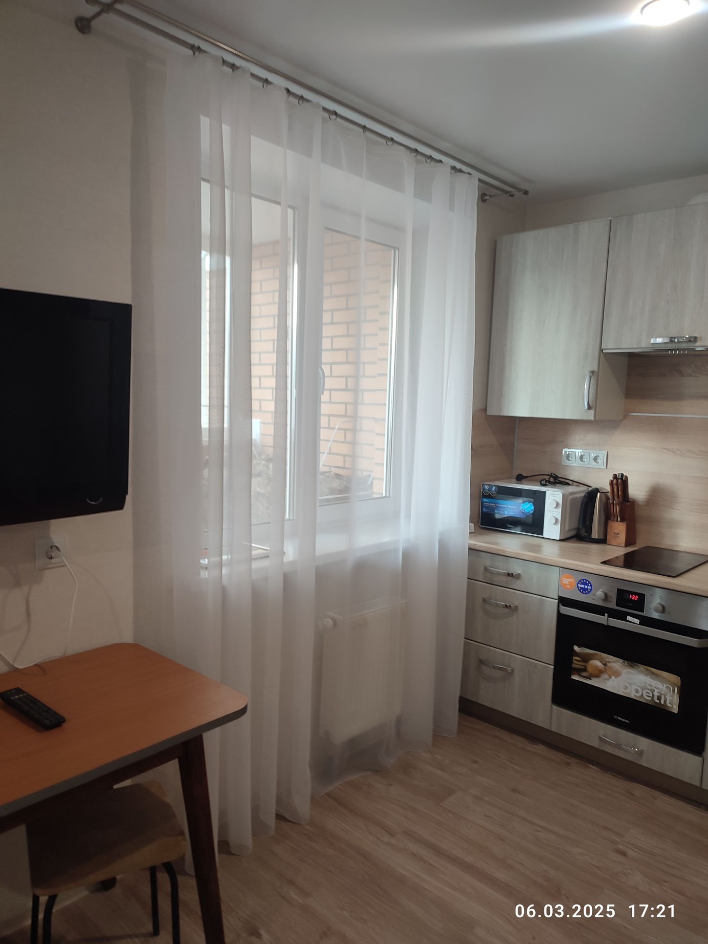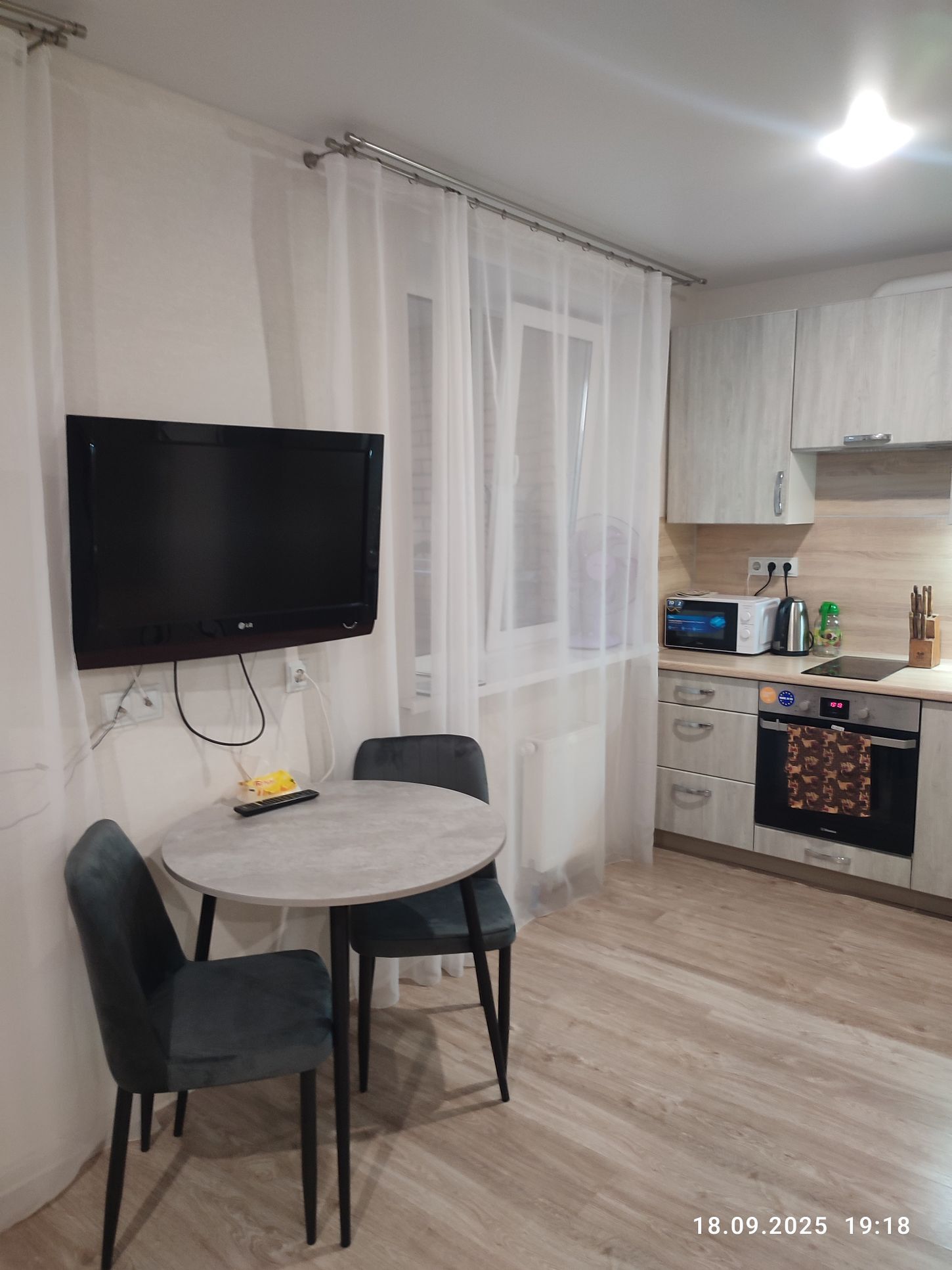 Комфортная, новая, евро студия! Небольшая, аккуратная с видом на город, двухспальный раскладной диван, а также раскладное кресло, полноценное спальное место, смарт телевизор ВНИМАНИЕ! залог не возвращается если оставлен мусор, не помыта посуда, а так же грязь, хаос после себя. Возврат залога после 18:00 при соблюдении правила. 28 м2. 3 гостя, 2 кровати, Кухня-гостиная, Этаж 5 из 12, Лифт, 1 ванная, комната, Бесплатная парковка. Кондиционер, Беспроводной интернет Wi-Fi, Телевизор, Электрический чайник, Фен, Микроволновка, Рабочий стол, Стиральная машина, Блэкаут шторы, Шкаф, Холодильник. Кухня-гостиная: Электроплита, Микроволновка, Фильтр для воды, Посуда и принадлежности, Столовые приборы, Электрический чайник, Холодильник, Морозильник, Кухонный гарнитур, Обеденный стол Ванная комната 1 туалет, 1 ванная комната с туалетом, Полотенца, Туалетные принадлежности, Фен, Душ, Тапочки, Гигиенический душ